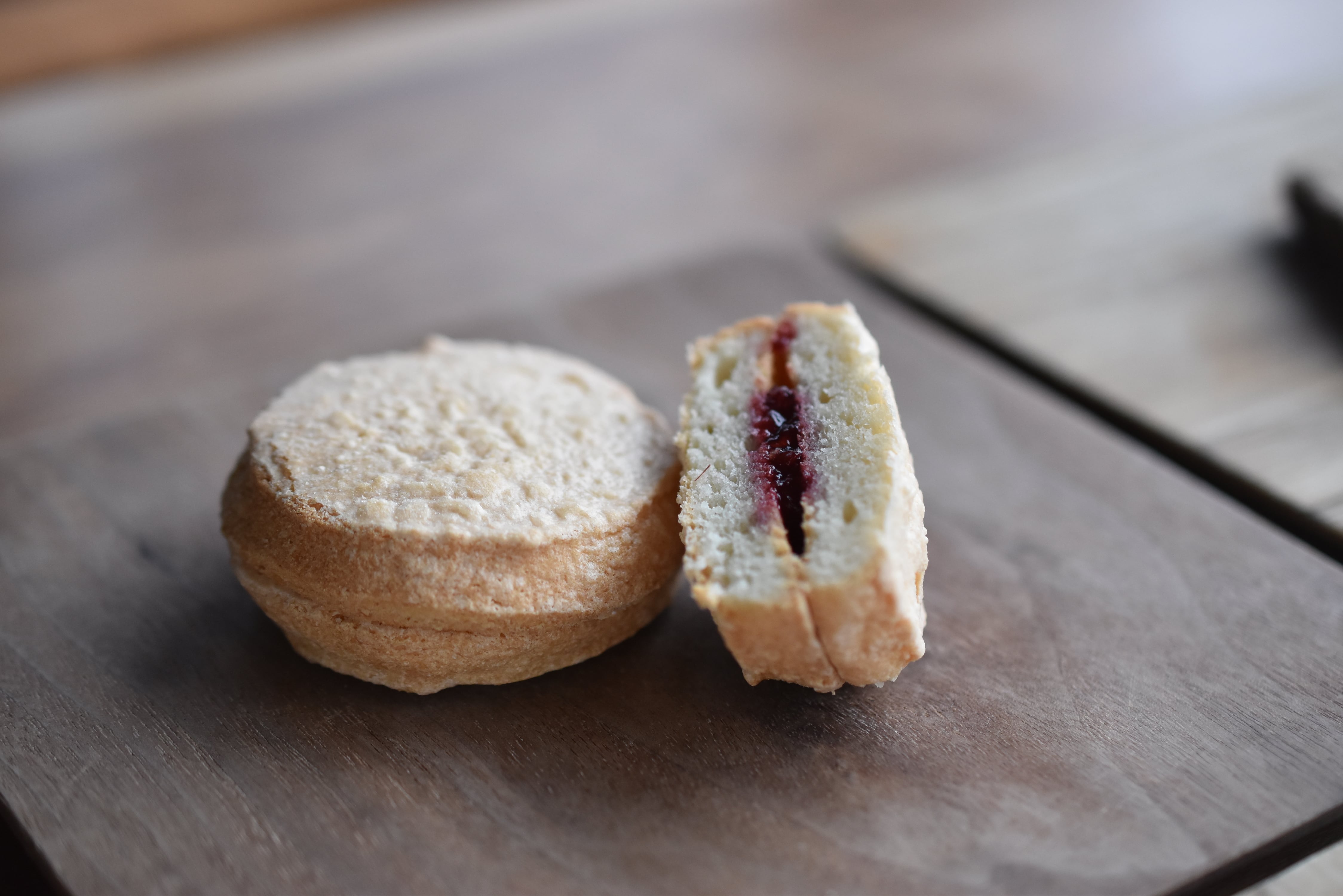 <ダックワーズ>アーモンドの香り豊かなふんわり優しい生地に甘酸っぱい自家製フランボワーズコンフィチュールをサンド。