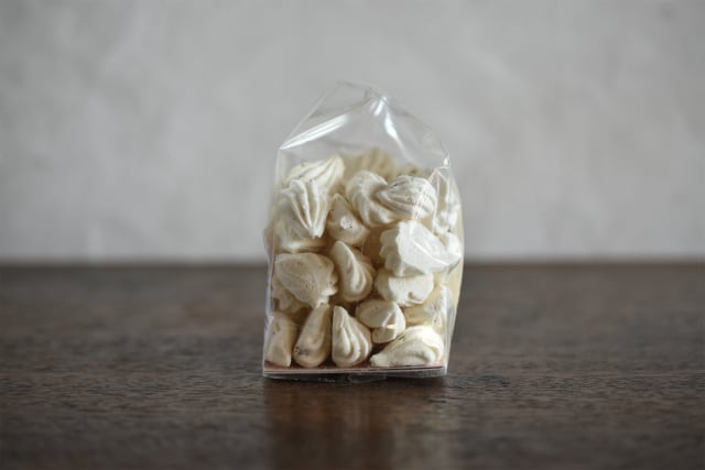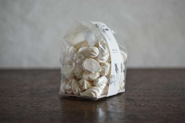ポッシュは仏語で絞り袋の意。低温でゆっくり焼き上げるメレンゲはスッと舌の上で溶けていきます。香料は一切使用せず、カフェで人気の京都ジェントルコーヒーさんの珈琲豆を卵に漬け込み香りを移します。干菓子のようにお茶請けにも。