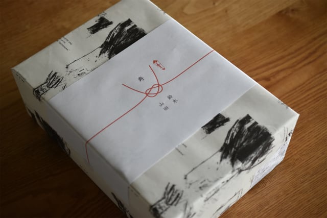 富田惠子さんの銅版画がプリントされた包装紙でお包みします。冨田惠子さんのポストカード付。